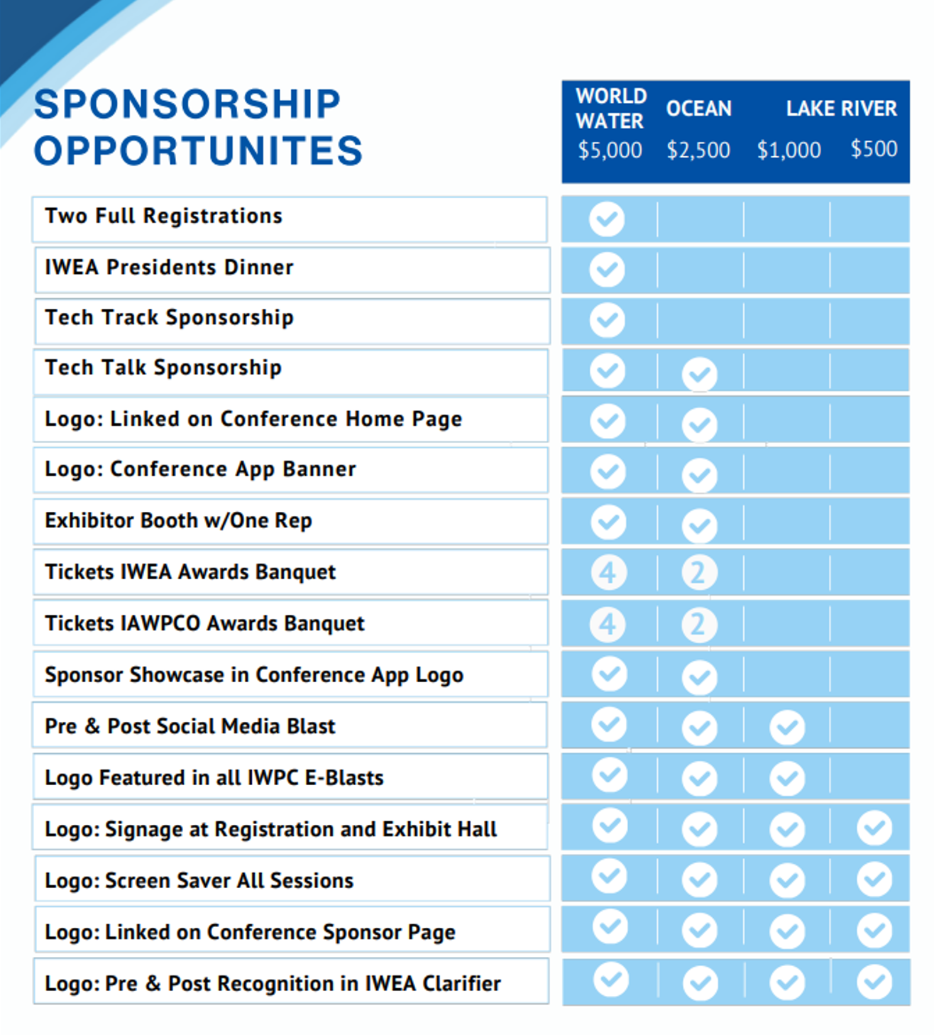 Sponsoring at the World Water and Ocean level includes a booth and the opportunity to make a short presentation to the targeted audience of your choice for maximum exposure! See below for more information on the Tech Talk and Tech Track as well as the sponsorship quick comparison guide.