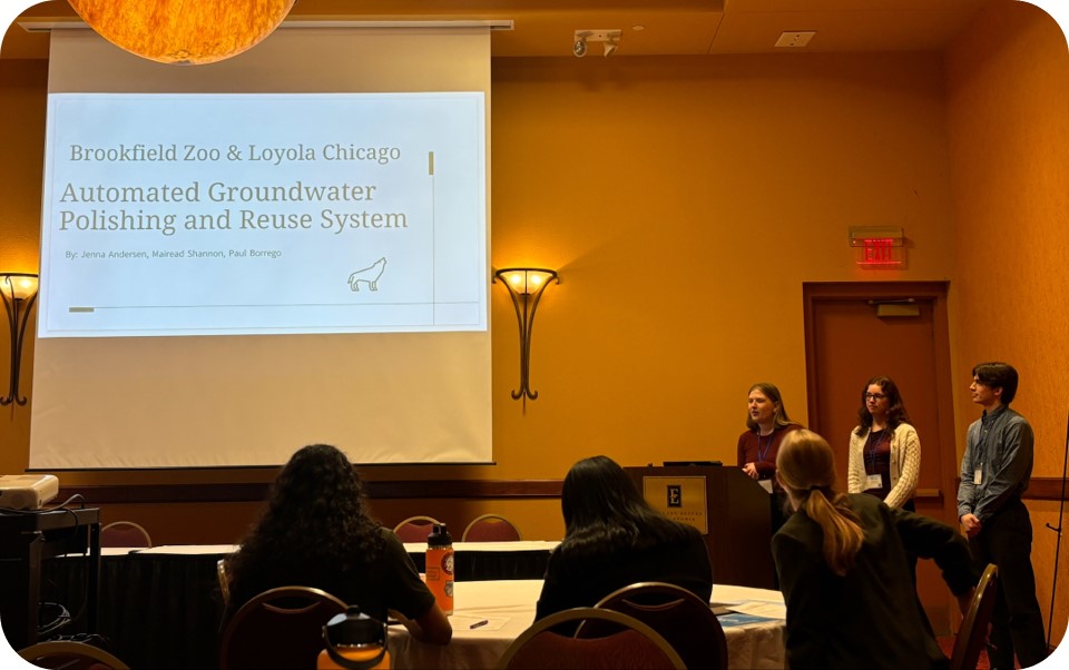 The winning team, consisting of Jenna Andersen, Paul Borrego, and Mairead Shannon, represented Loyola University. As SDC winners, they received a cash prize, a travel allowance, and the opportunity to compete in the national SDC at WFFTEC 2025 in Chicago! Their presentation was titled Brookfield Zoo Automated Groundwater Polishing and Reuse.